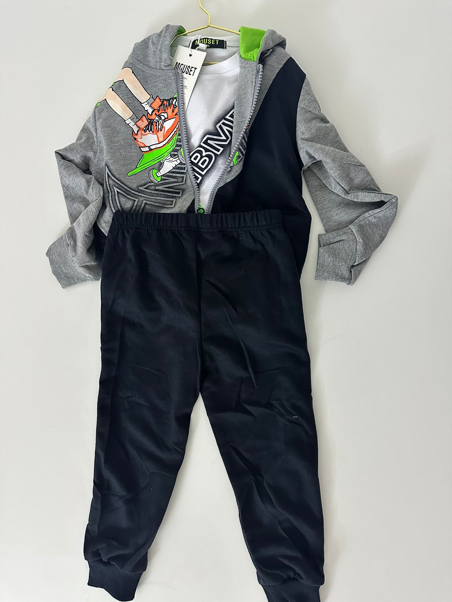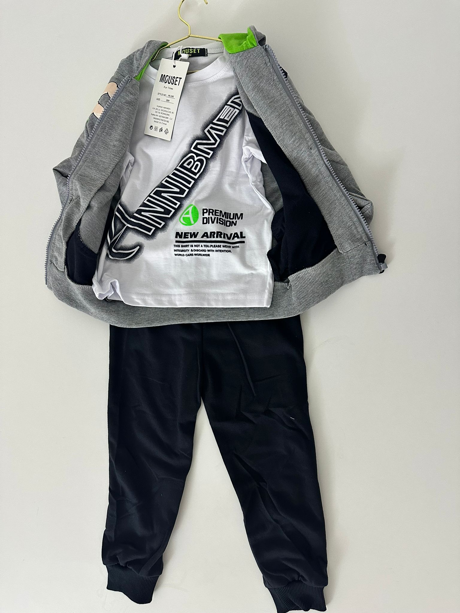 Completo in tuta leggera maglietta bianca manica corta, pantalone nero e felpa grigia con stampa