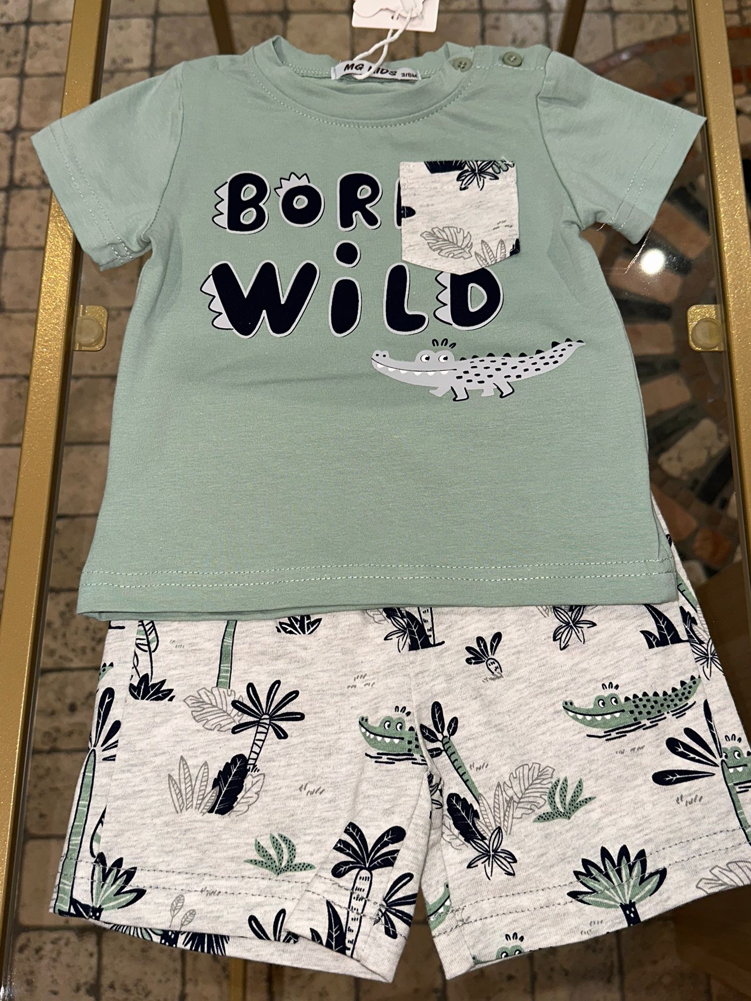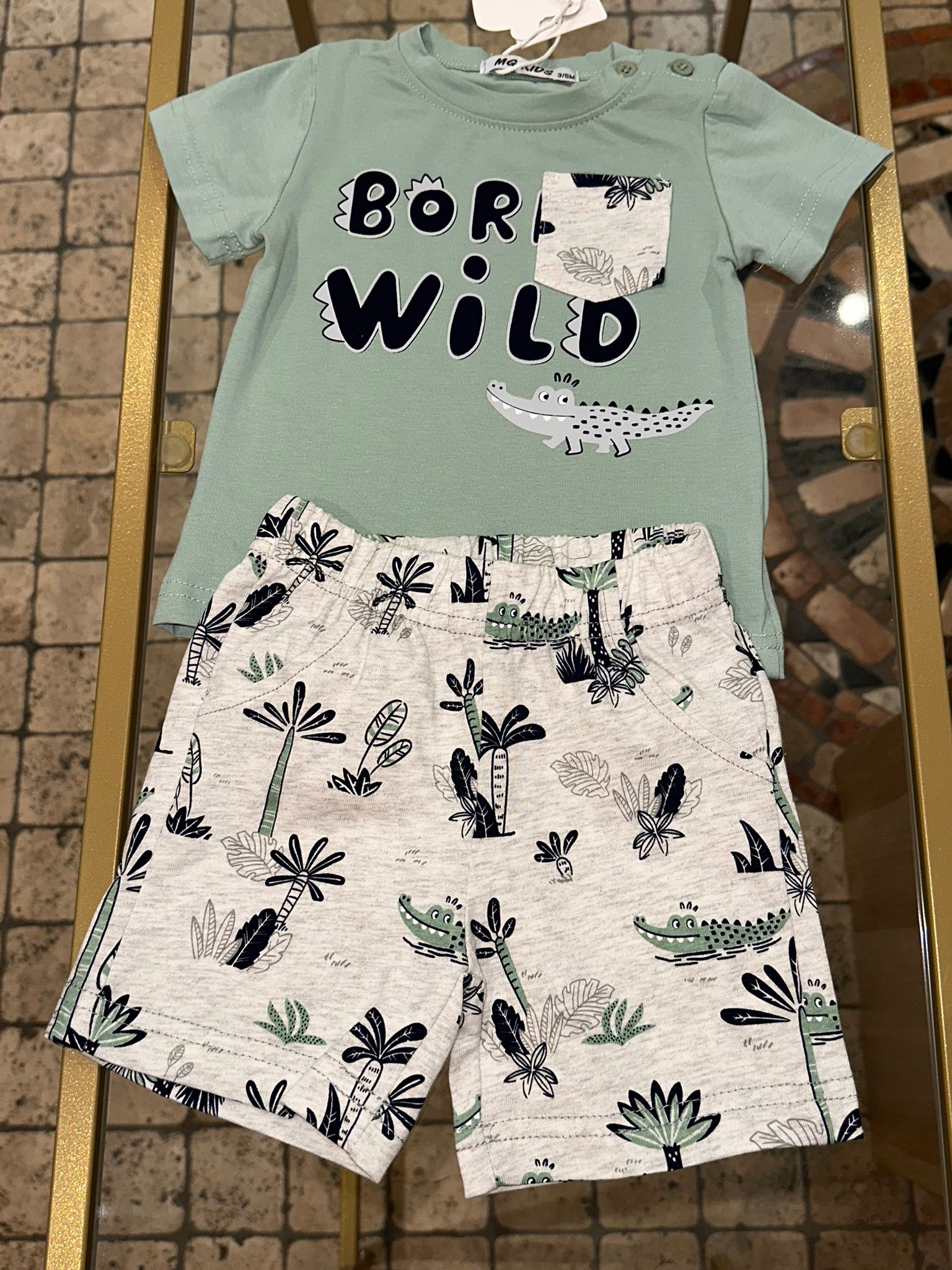 Completo Wild maglia a manica corta verde salvia e pantaloncino grigio disegni coccodrillo e palma