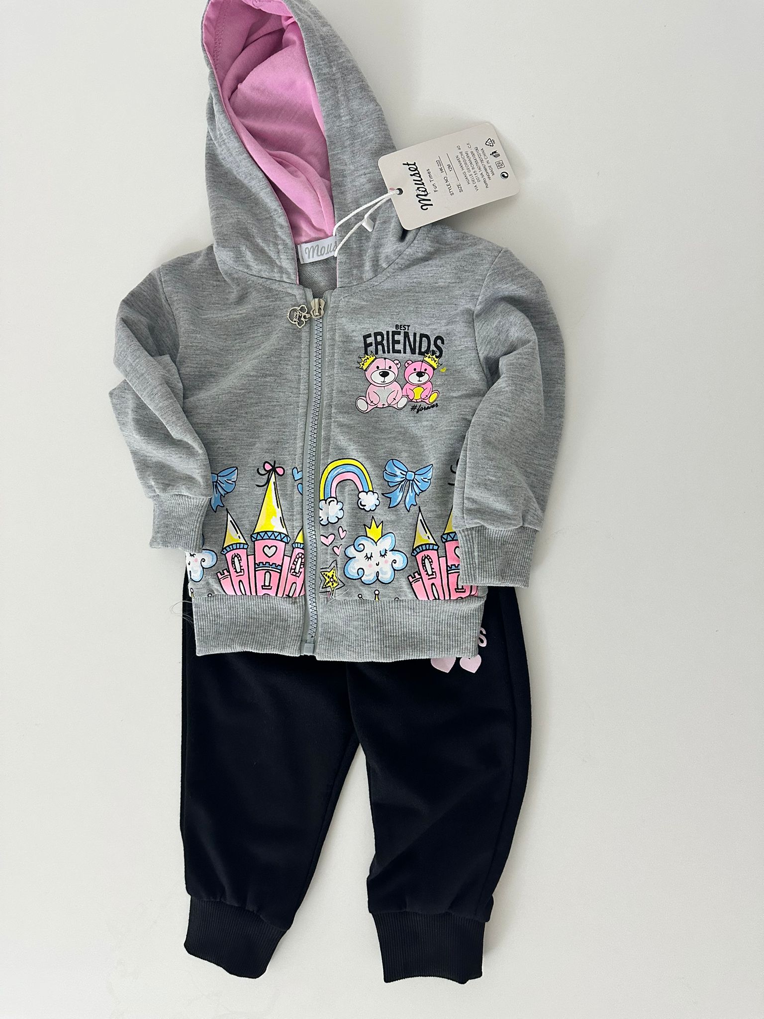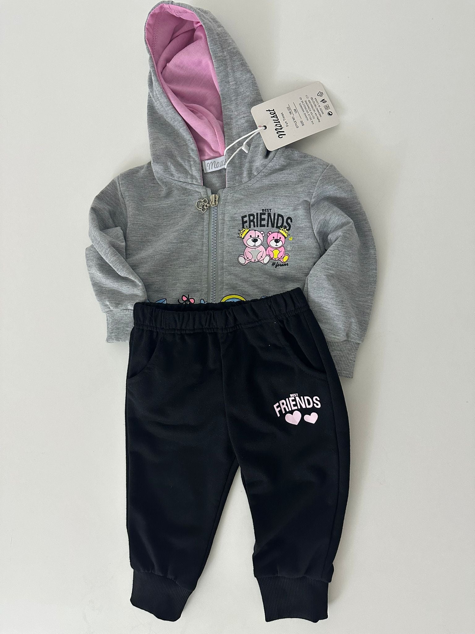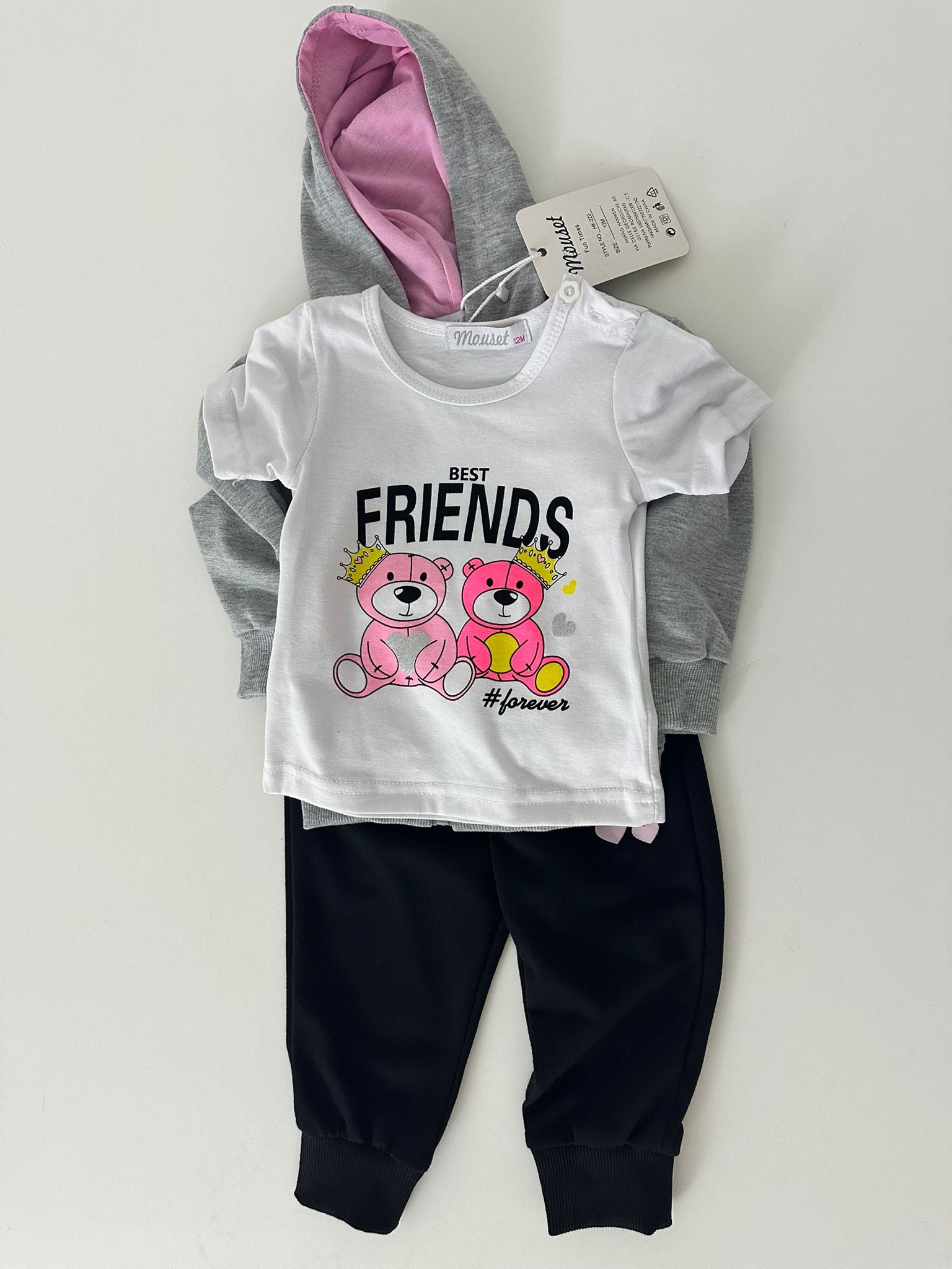 Tuta leggera con maglia manica corta bianca con stampa orsi, felpa grigia con stampe e pantalone nero